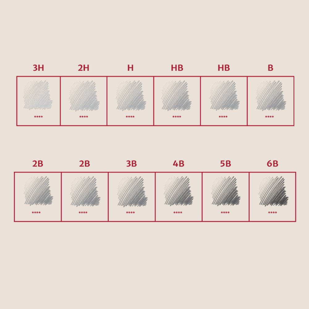 Graduations range from H (Hard) for hardness to B (Bold) for softness. The higher the number, the harder or softer the pencil.